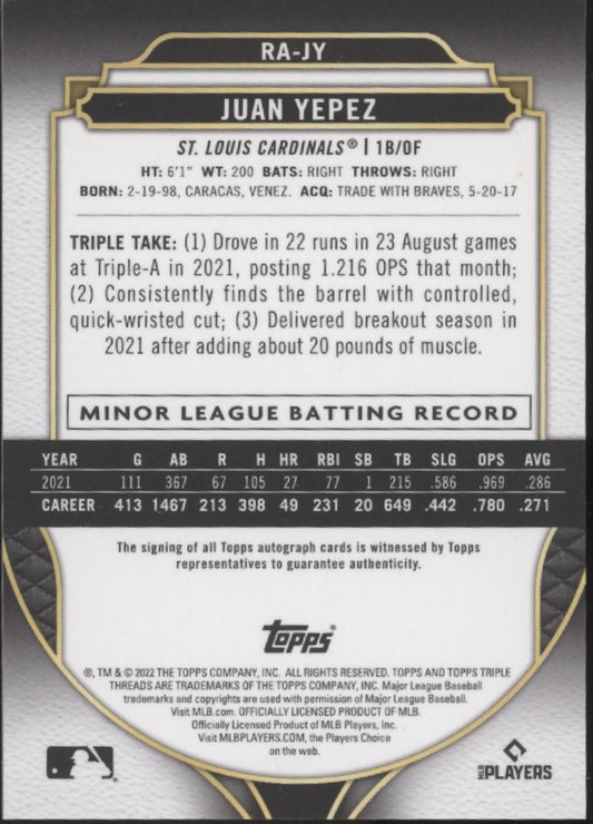 Juan Yepez 2022 Topps Triple Threads Gold RC Auto 11/25 #RA-JYRegular price $10.00Regular priceUnit price per-