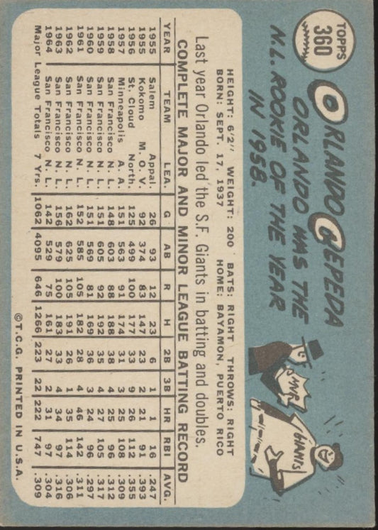 Orlando Cepeda 1965 Topps #360 San Francisco Giants VG #1Regular price $15.00Regular priceUnit price per-