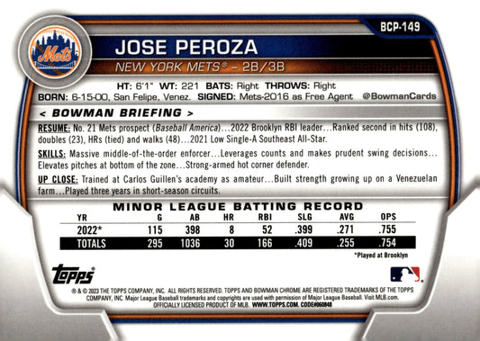 Jose Peroza 2023 Bowman Chrome Sapphire Blue Ice Refractor #BCP-149