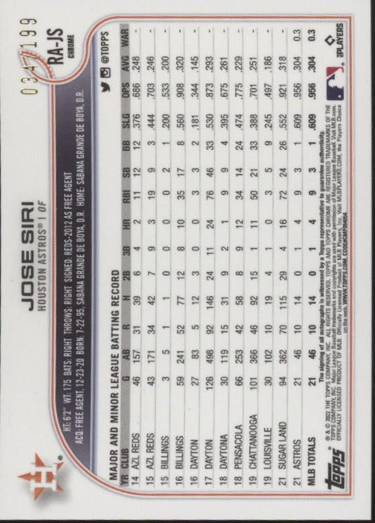Jose Siri 2022 Topps Chrome Aqua Wave Refractor RC Auto 034/199 #RA-JS