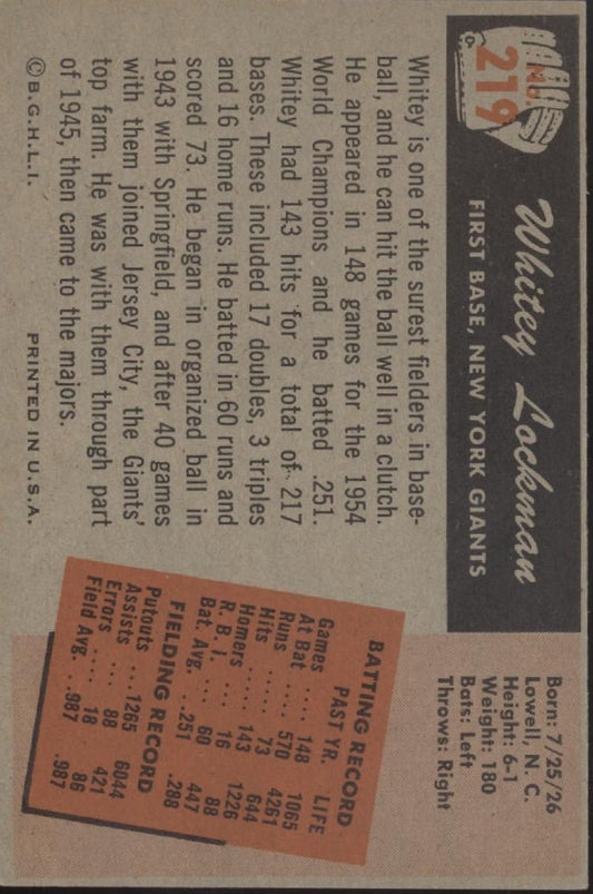 Whitey Lockman 1955 Bowman #219 New York Giants EX #2