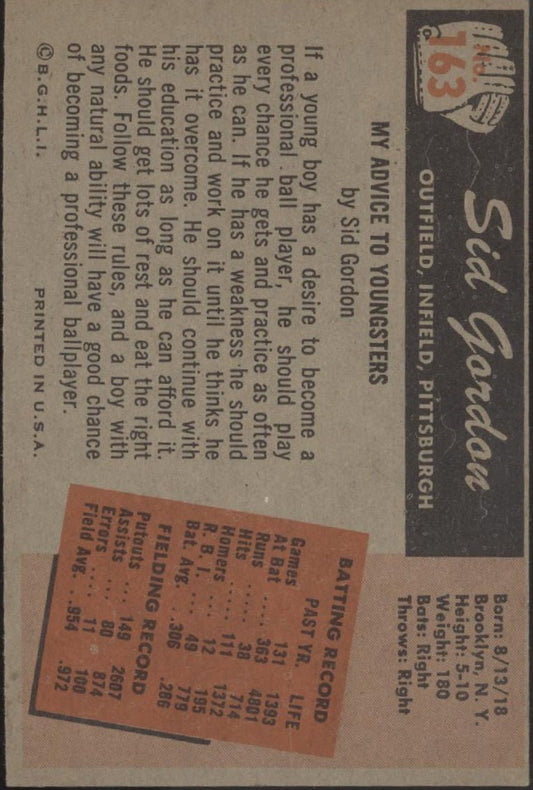 Sid Gordon 1955 Bowman #163 Pittsburgh Pirates EX
