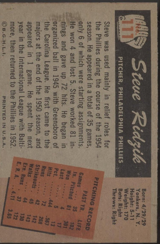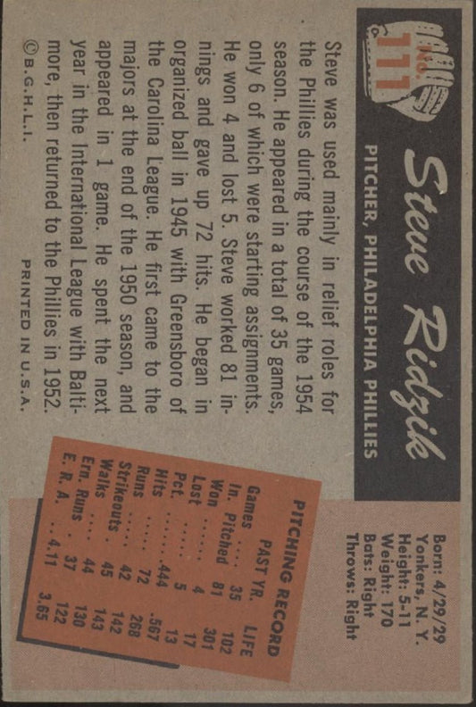 Steve Ridzik 1955 Bowman #111 Philadelphia Phillies EX #1
