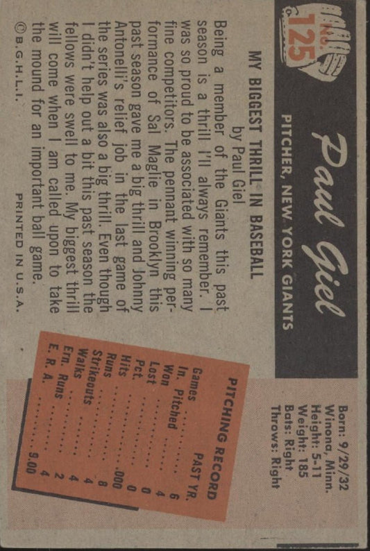 Paul Giel 1955 Bowman RC #125 New York Giants VG #1