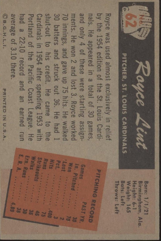 Royce Lint 1955 Bowman #62 St. Louis Cardinals VG