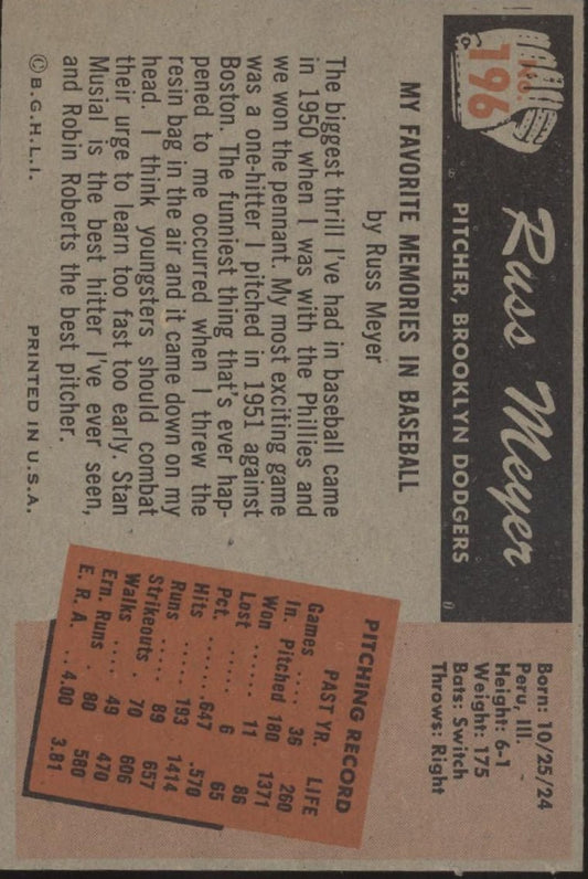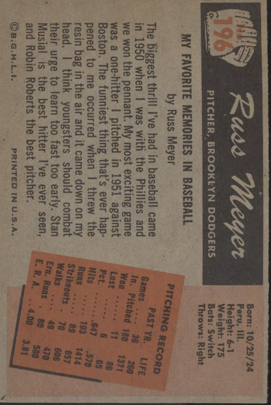 Russ Meyer 1955 Bowman #196 Brooklyn Dodgers EX #1