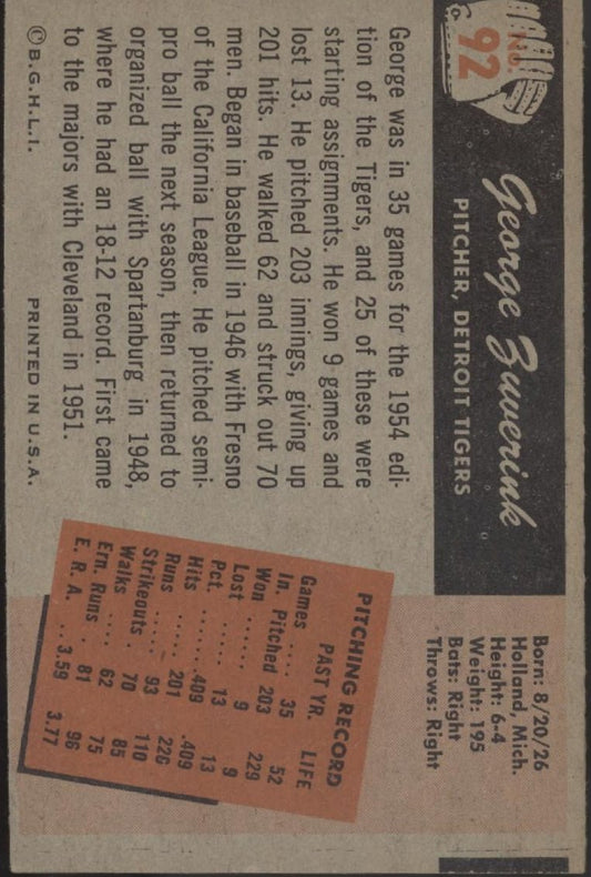 George Zuverink 1955 Bowman #92 Detroit Tigers VG-EX #2