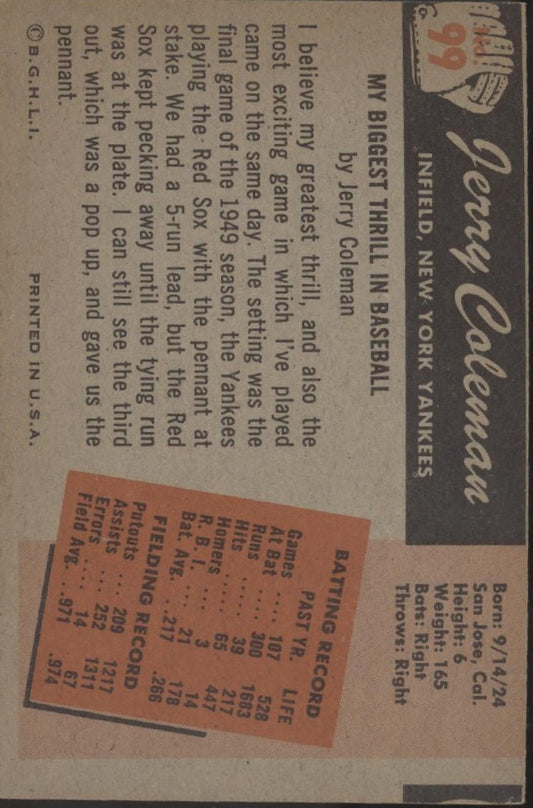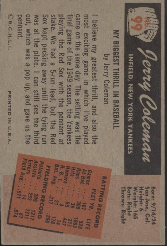 Jerry Coleman 1955 Bowman #99 New York Yankees VG-EX #2