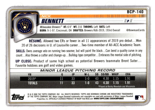 Nick Bennett 2020 Bowman Chrome Mojo Refractor #BCP-140
