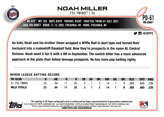Noah Miller 2022 Topps Pro Debut Auto #PD-61