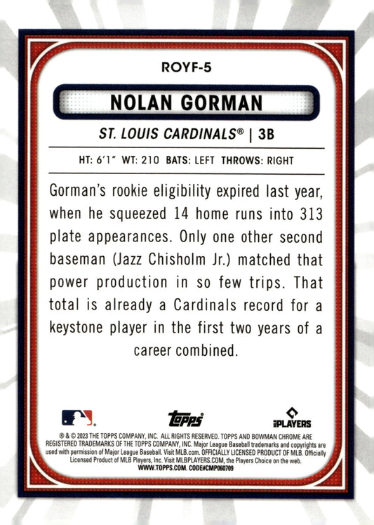 Nolan Gorman 2023 Bowman Chrome Rookie of the Year Favorites Refractor RC #5