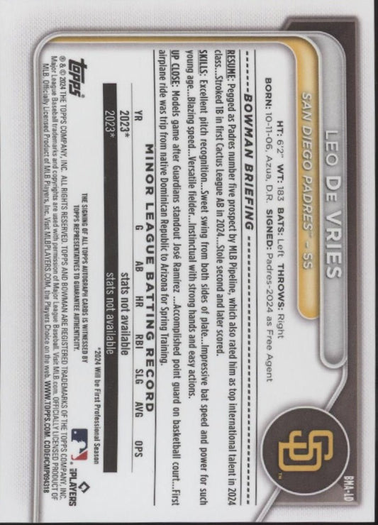 Leo De Vries 2024 Bowman Chrome Purple Mojo Refractor Auto 089/199 #BMA-LD