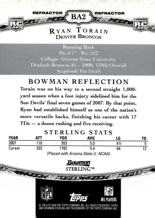 Ryan Torain 2008 Bowman Sterling Blue Refractor RC Auto #BA2