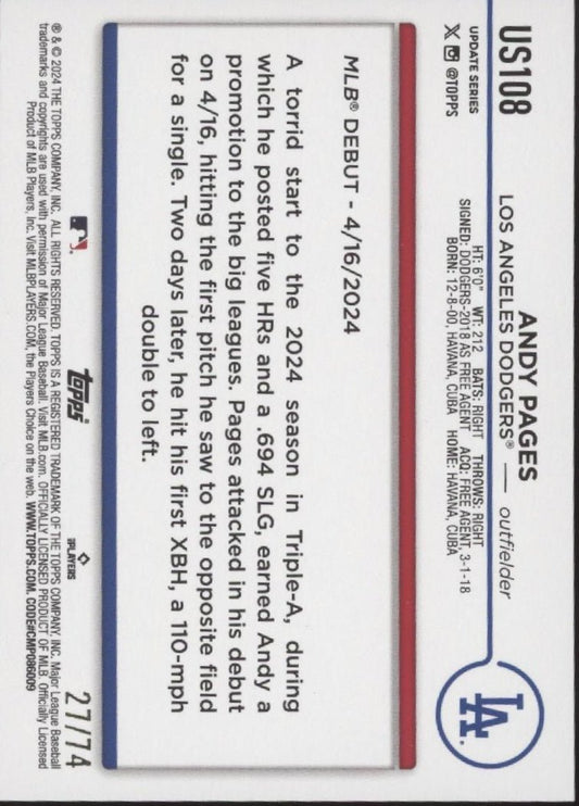Andy Pages 2024 Topps Update Series Black Border RC 27/74 #US108