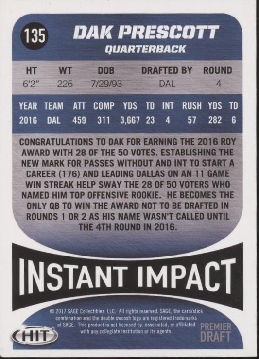 Dak Prescott 2017 Sage Hit Rookie of the Year Instant Impact #135