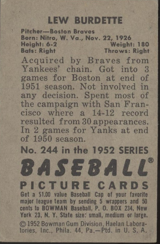 Lew Burdette 1952 Bowman RC #244 Boston Braves VG-EX