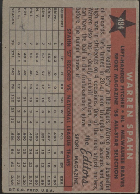 Warren Spahn 1958 Topps #494 Milwaukee Braves EX