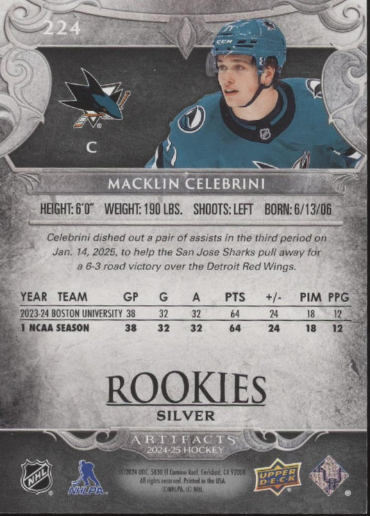 Macklin Celebrini 2024-25 Upper Deck Artifacts Rookies Silver RC #224