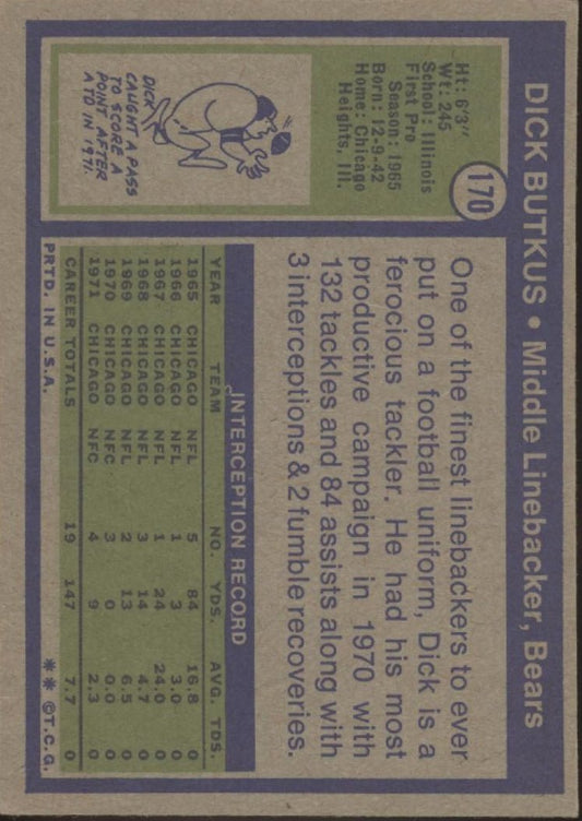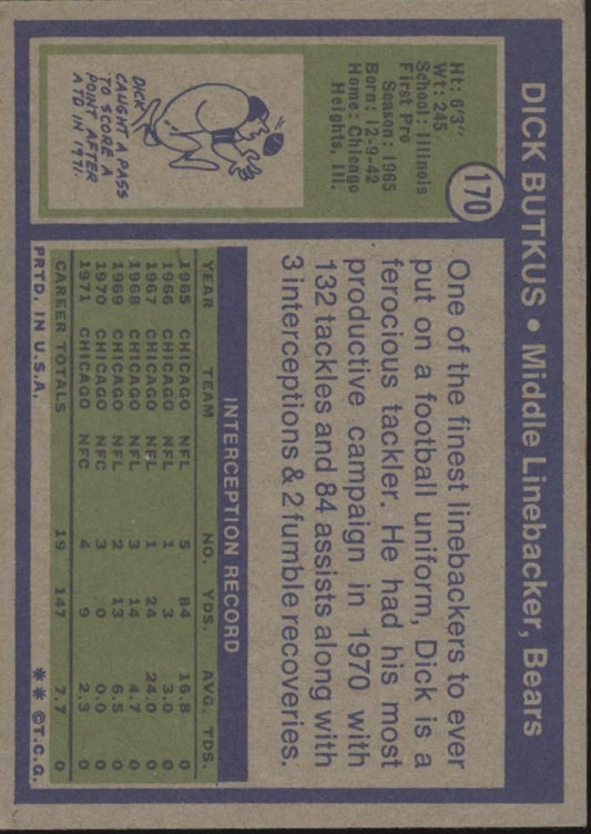 Dick Butkus 1972 Topps #170 Chicago Bears EX #1