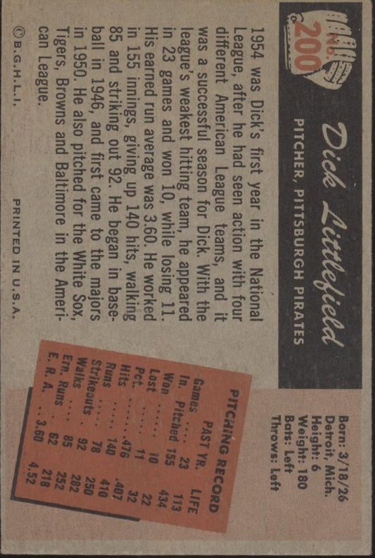 Dick Littlefield 1955 Bowman #200 Pittsburgh Pirates VG