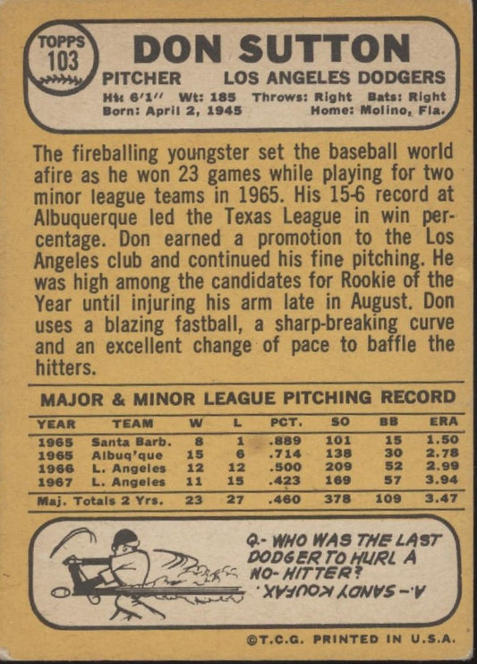 Don Sutton 1968 Topps #103 Los Angeles Dodgers GD #1