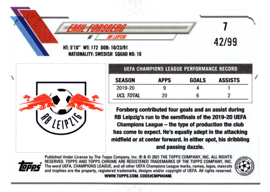 Emil Forsberg 2020-21 Topps Chrome UCL Neon Green Refractor 42/99 #7