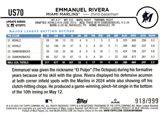 Emmanuel Rivera 2024 Topps Update Series Blue Foil 918/999 #US70