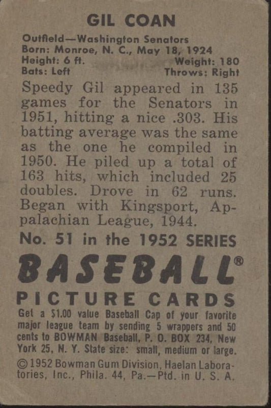 Gil Coan 1952 Bowman #51 Washington Senators VGRegular price $5.00Regular priceUnit price per