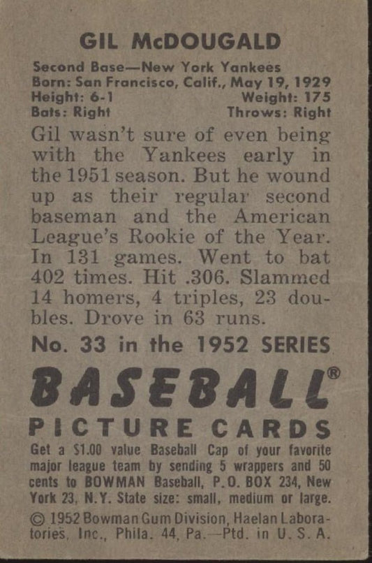 Gil McDougald 1952 Bowman RC #33 New York Yankees VG-EXRegular price $40.00Regular priceUnit price per-