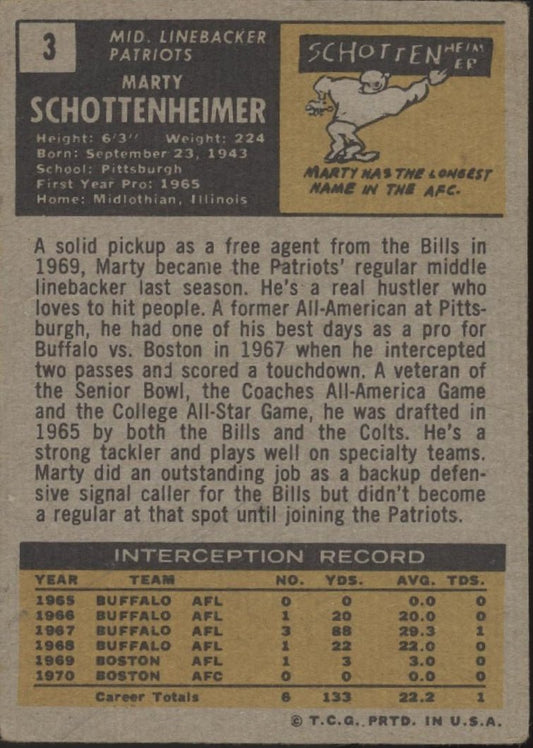Marty Schottenheimer 1971 Topps RC #3 New England Patriots PR