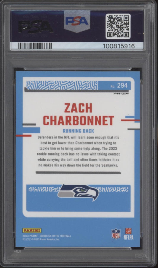Zach Charbonnet 2023 Donruss Optic Rated Rookie Blue Hyper Prizm RC #294 PSA 9