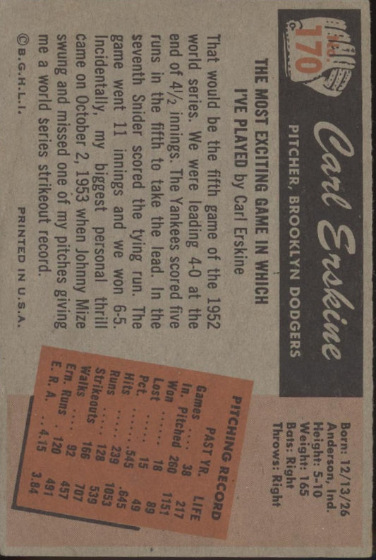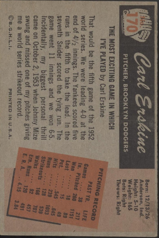 Carl Erskine 1955 Bowman #170 Brooklyn Dodgers VG #1