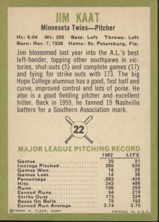 Jim Kaat 1963 Fleer #22 Minnesota Twins VG #2