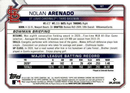Nolan Arenado 2021 Bowman Chrome Veterans Blue Ice Refractor #67