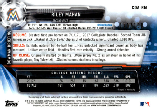 Riley Mahan 2017 Bowman Chrome Blue Refractor Auto 110/150 #CDA-RM