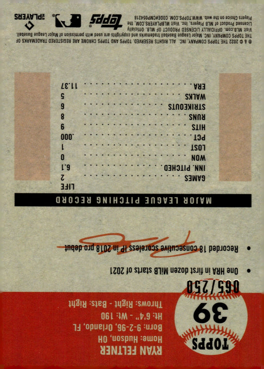 Ryan Feltner 2022 Topps Chrome Platinum Yellow Ray Wave Refractor RC 065/250