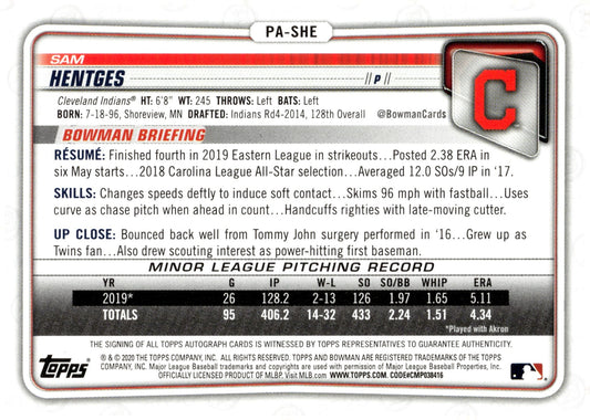 Sam Hentges 2020 Bowman Purple Auto 123/250 #PA-SHE