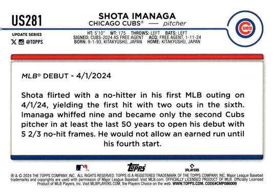 Shota Imanaga 2024 Topps Update Series Foil RC #US281