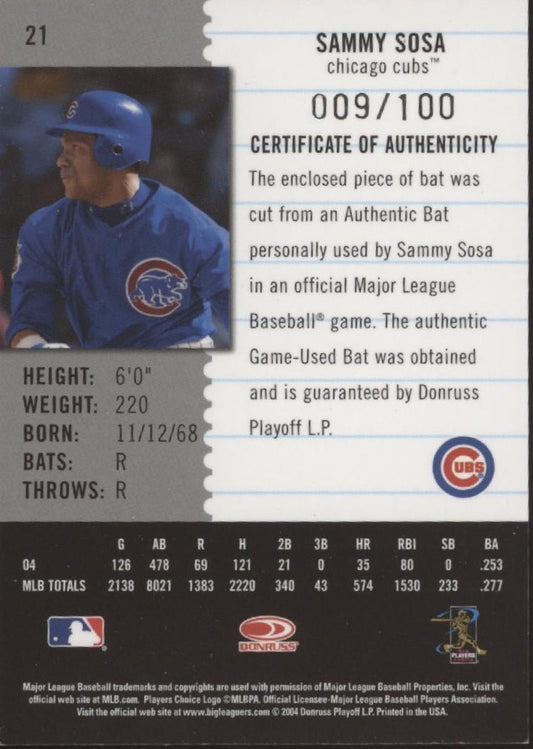 Sammy Sosa 2004 Leaf Century Collection Bat Relic 009/100 #21