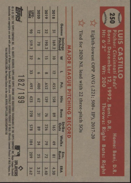 Luis Castillo 2021 Topps Chrome Platinum Blue Mini Diamond Refractor 182/199