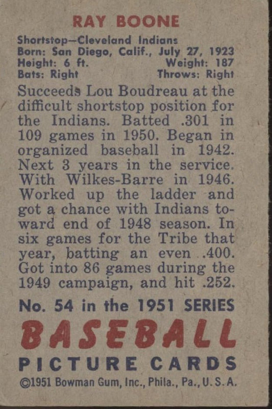 Ray Boone 1951 Bowman RC #54 Cleveland Indians VG