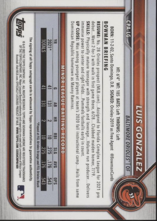 Luis Gonzalez 2022 Bowman Chrome Prospects Orange Refractor Auto 09/25 #CPA-LG