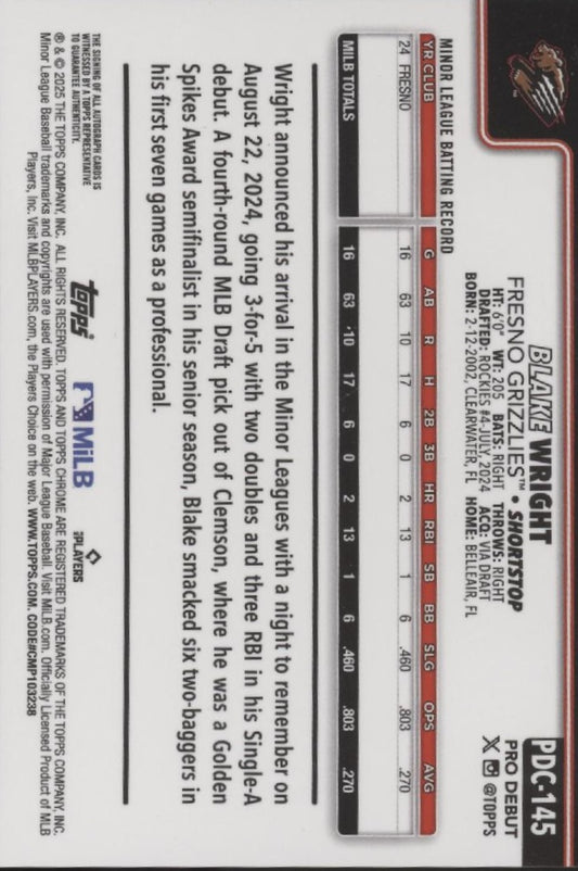 Blake Wright 2025 Topps Chrome Pro Debut Orange Refractor Auto 13/25 #PDC-145
