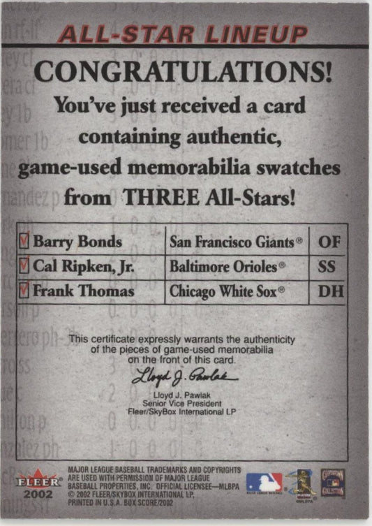 Bonds / Ripken / Thomas 2002 Fleer Box Score All-Star Lineup Relics