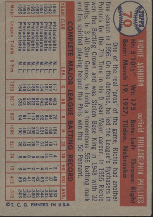 Richie Ashburn 1957 Topps #70 Philadelphia Phillies VG