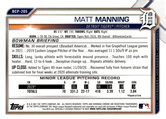 Matt Manning 2021 Bowman Chrome Prospects Purple Refractor 038/250 #BCP-205