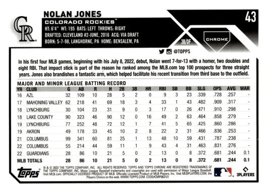 Nolan Jones 2023 Topps Chrome Pink Refractor RC #43