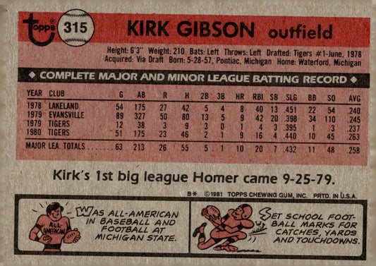 Kirk Gibson 1981 Topps #315 Detroit Tigers