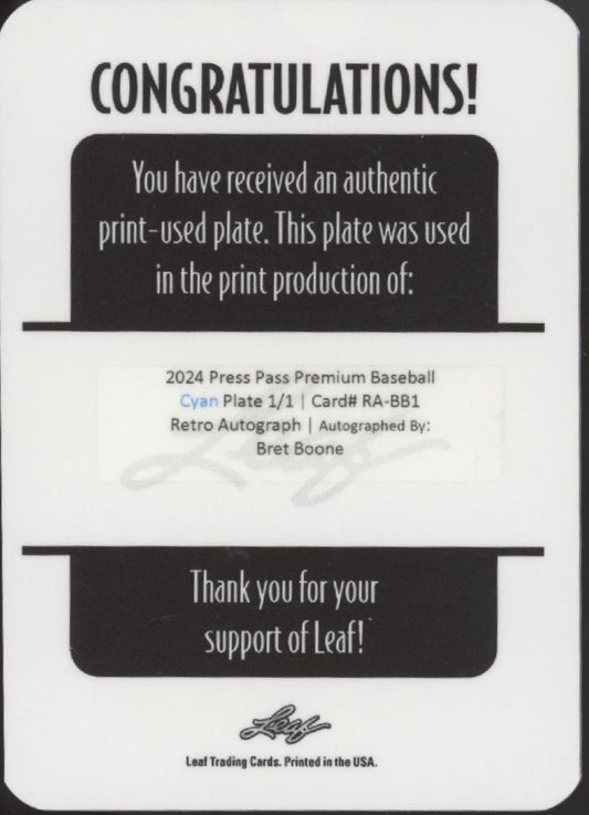 Bret Boone 2024 Leaf Press Pass Premium Cyan Plate Retro Auto 1/1