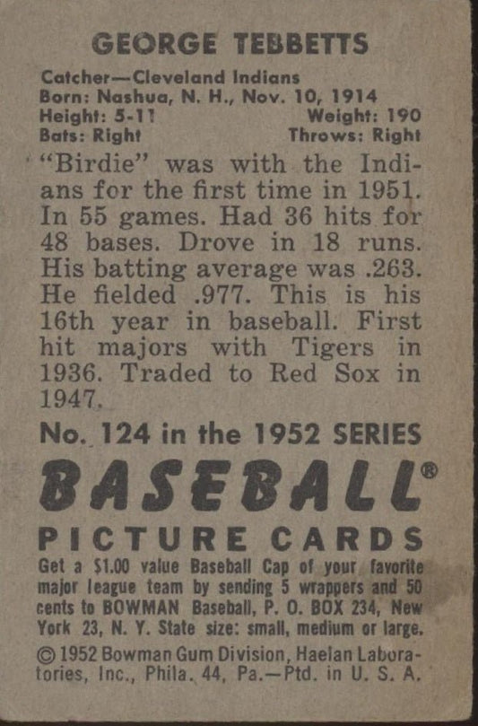 George Tebbetts 1952 Bowman #124 Cleveland Indians VG-EX